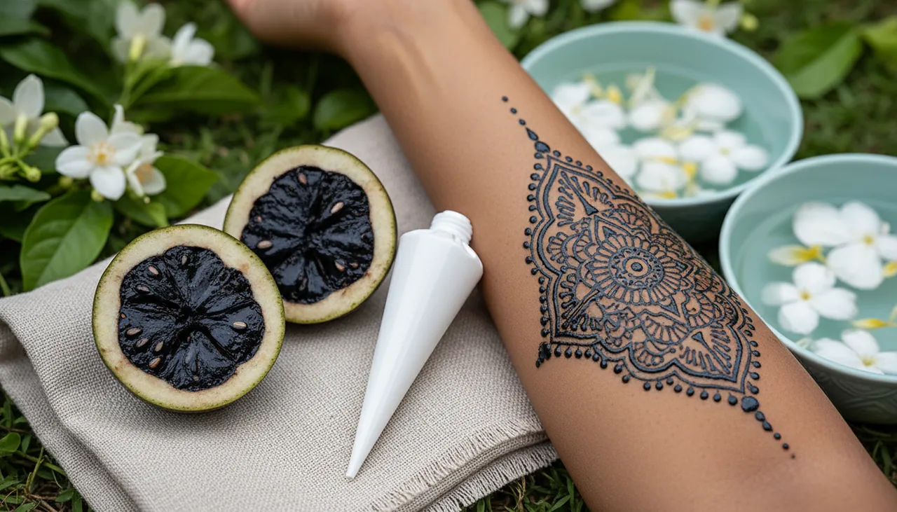 Pour celles qui se demandent "le jagua c'est quoi ?", il s'agit d'un extrait de fruit naturel (le Genipa americana) originaire d'Amérique du Sud. Contrairement au henné traditionnel qui offre des teintes cuivrées, le jagua teint la peau dans des nuances intenses de bleu nuit à noir. C'est une révélation pour celles qui rêvent d'un rendu profond sans aucun danger. En effet, il se positionne comme l'alternative 100% naturelle et sûre au dangereux Henné Noir.