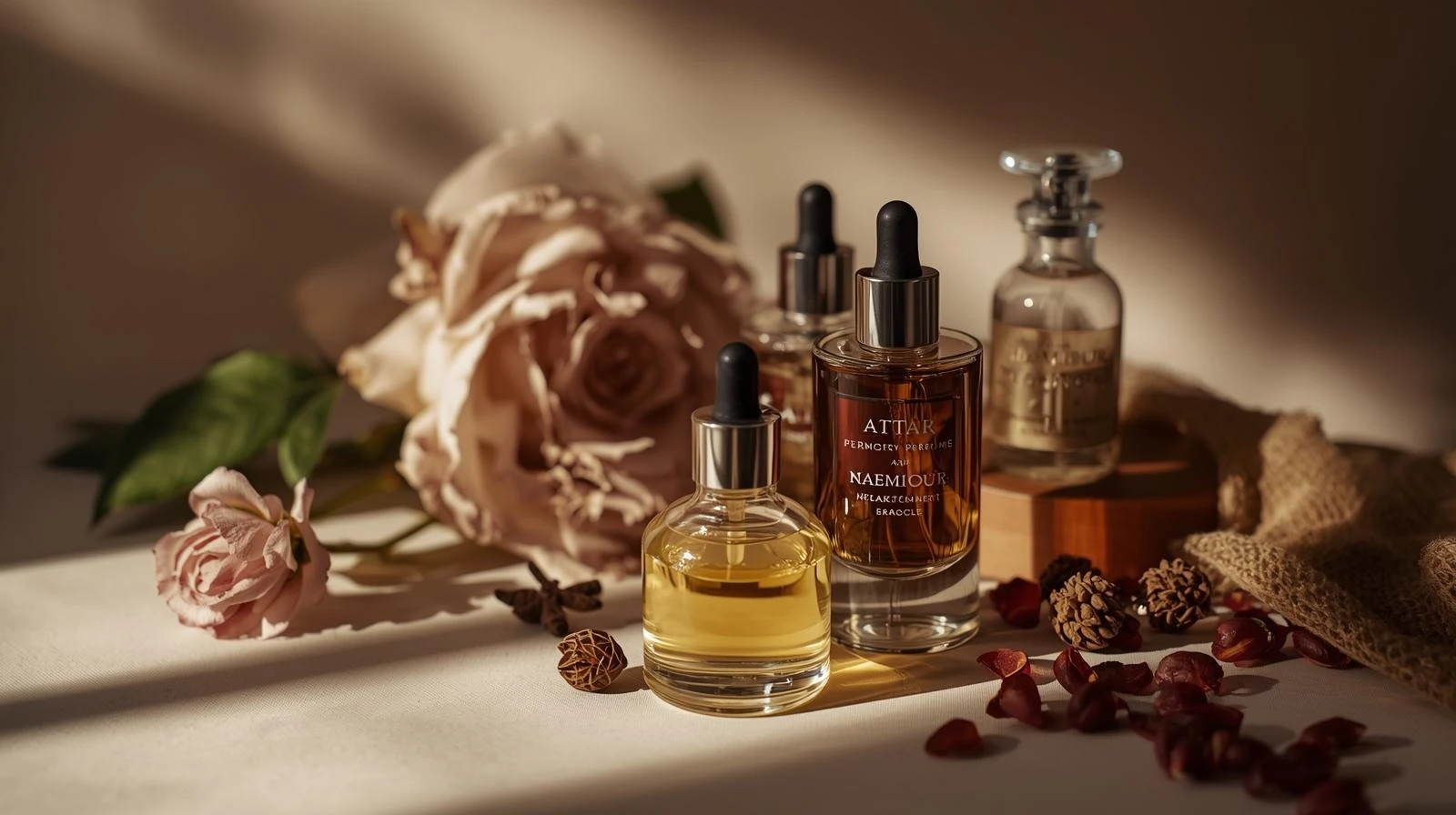 Attar : essences naturelles (rose, jasmin, oud) macérées dans des bases végétales.