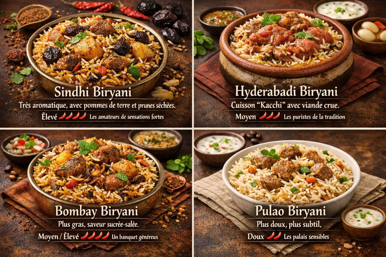 Le Biryani est bien plus qu'un simple mélange de riz et de viande. C'est un chef-d'œuvre culinaire complexe où le riz basmati à grains longs est cuit en couches alternées avec une viande marinée aux épices (safran, cardamome, clous de girofle, cannelle).