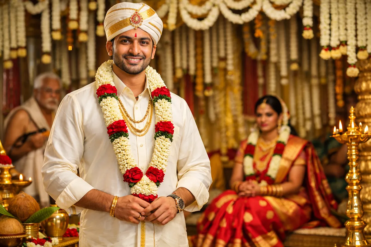 Contrairement aux idées reçues, le marié tamoul porte rarement un Sherwani (plus courant au Nord de l'Inde) lors de la cérémonie religieuse (Muhurtham). La star, c'est le Veshti (aussi appelé Dhoti dans d'autres régions).