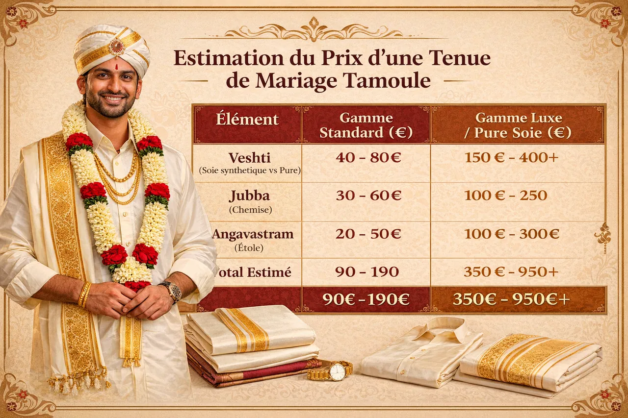 Le mariage tamoul est une célébration vibrante de couleurs, de rituels ancestraux et d'émotions intenses. Si la mariée attire souvent tous les regards avec ses saris Kanjeevaram éblouissants, le marié n'est pas en reste. Pour incarner l'élégance et le respect des traditions, le choix de la tenue traditionnelle homme tamoul est crucial. En tant que rédacteur chez Desi Corner, je vous guide à travers les subtilités du Veshti et de la Jubba pour être majestueux le jour J.